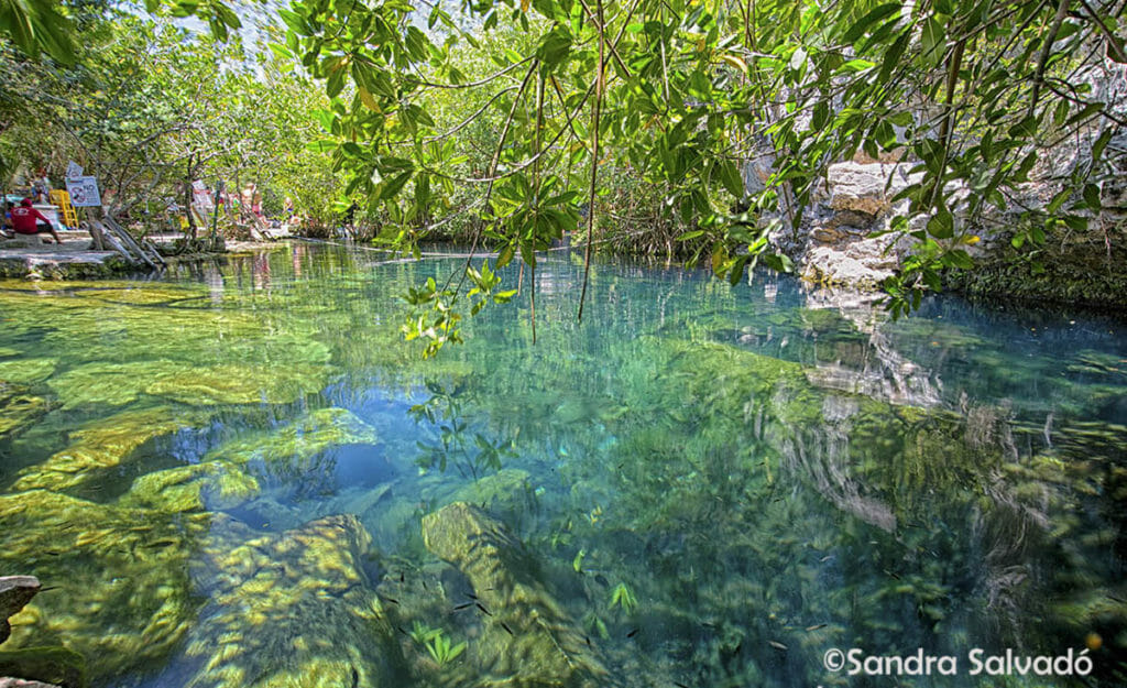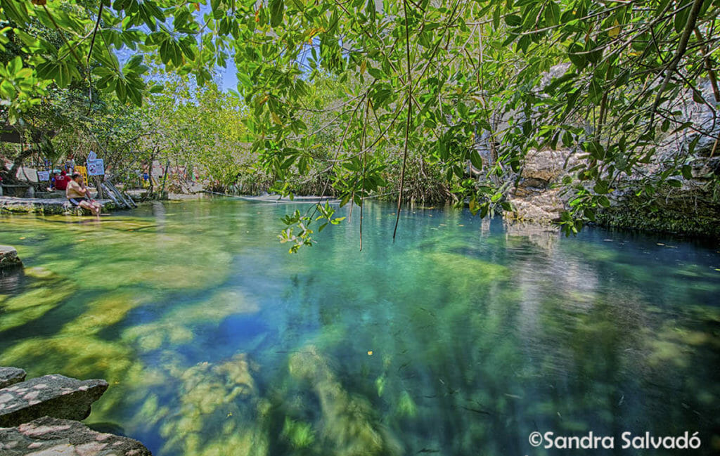 You can play with the camera exposure to get different effects of the water. It is a cenote with many interesting angles to play with the camera.